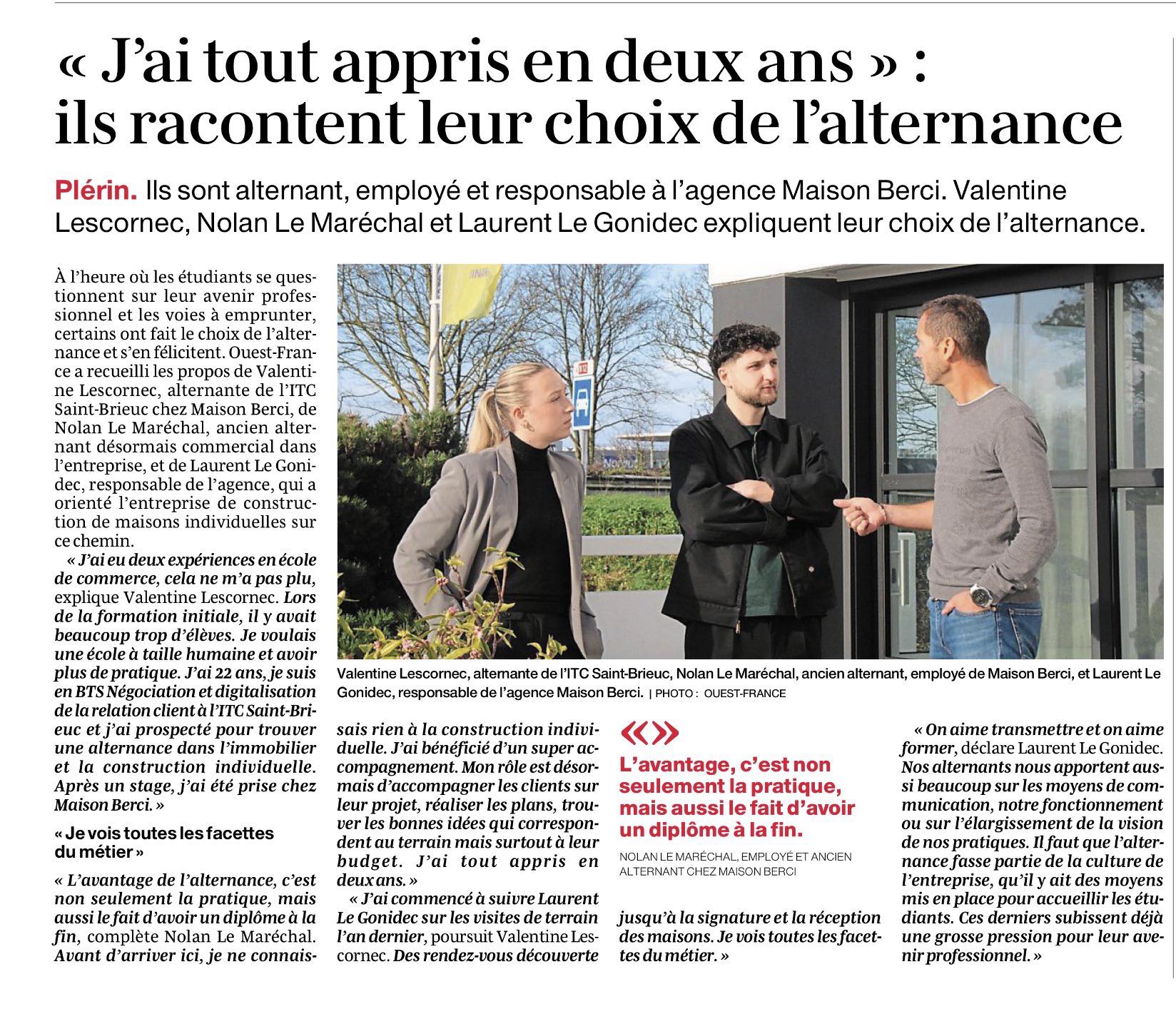 Article Ouest-france : L’alternance chez Maisons Berci : former et accompagner les talents de demain